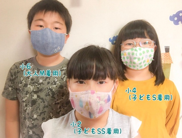小2女児(子どもSS)、小4女児(子どもS)、小6男児(大人M)がそれぞれを着用しています。